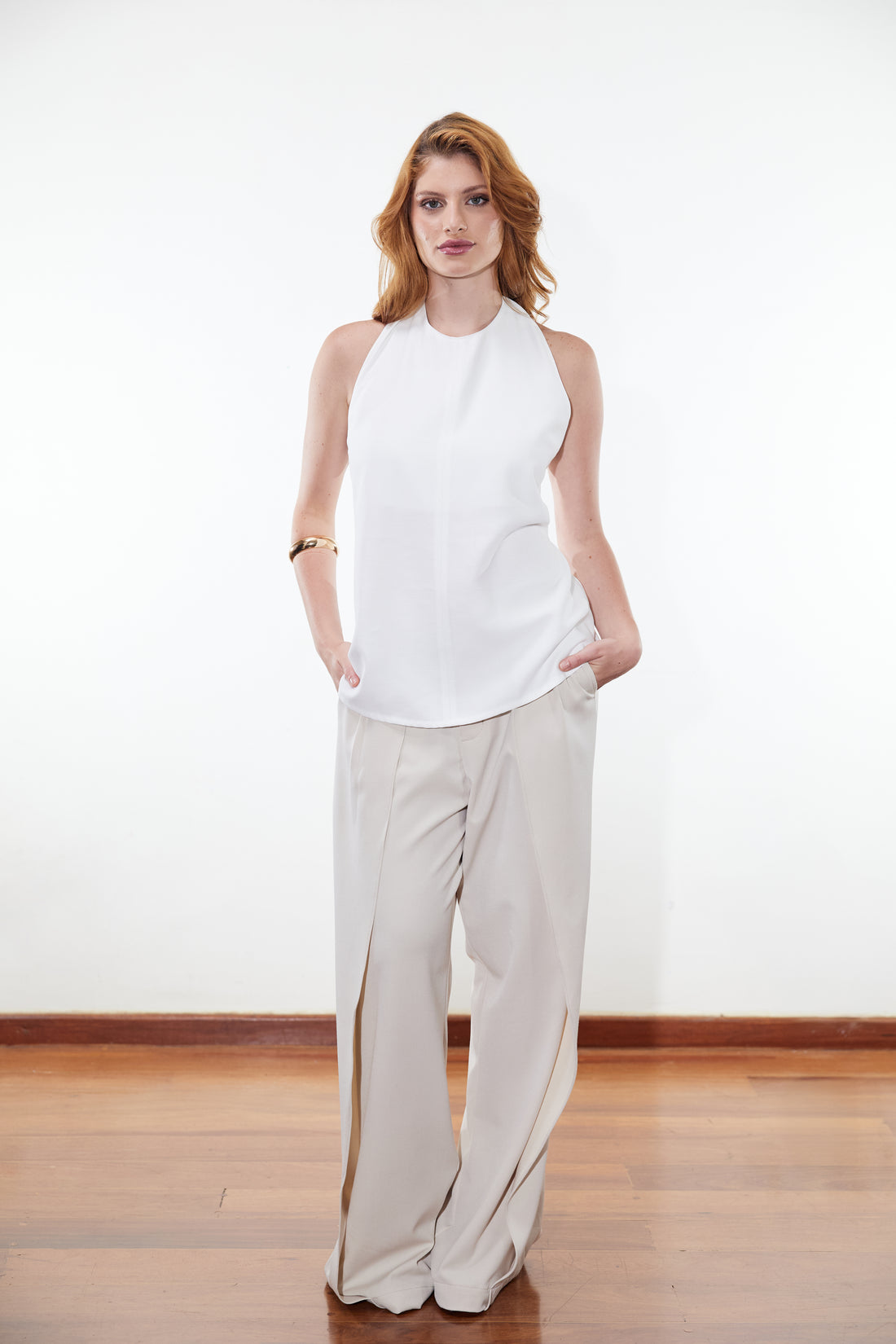 Calça tipo alfaiataria, conta com bolso faca, bolsos embutidos nas costas e fechamento através de...
