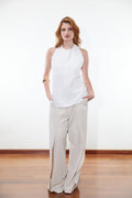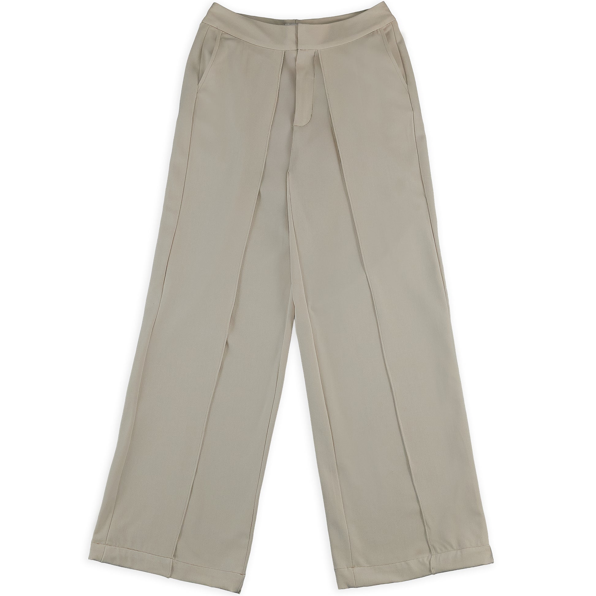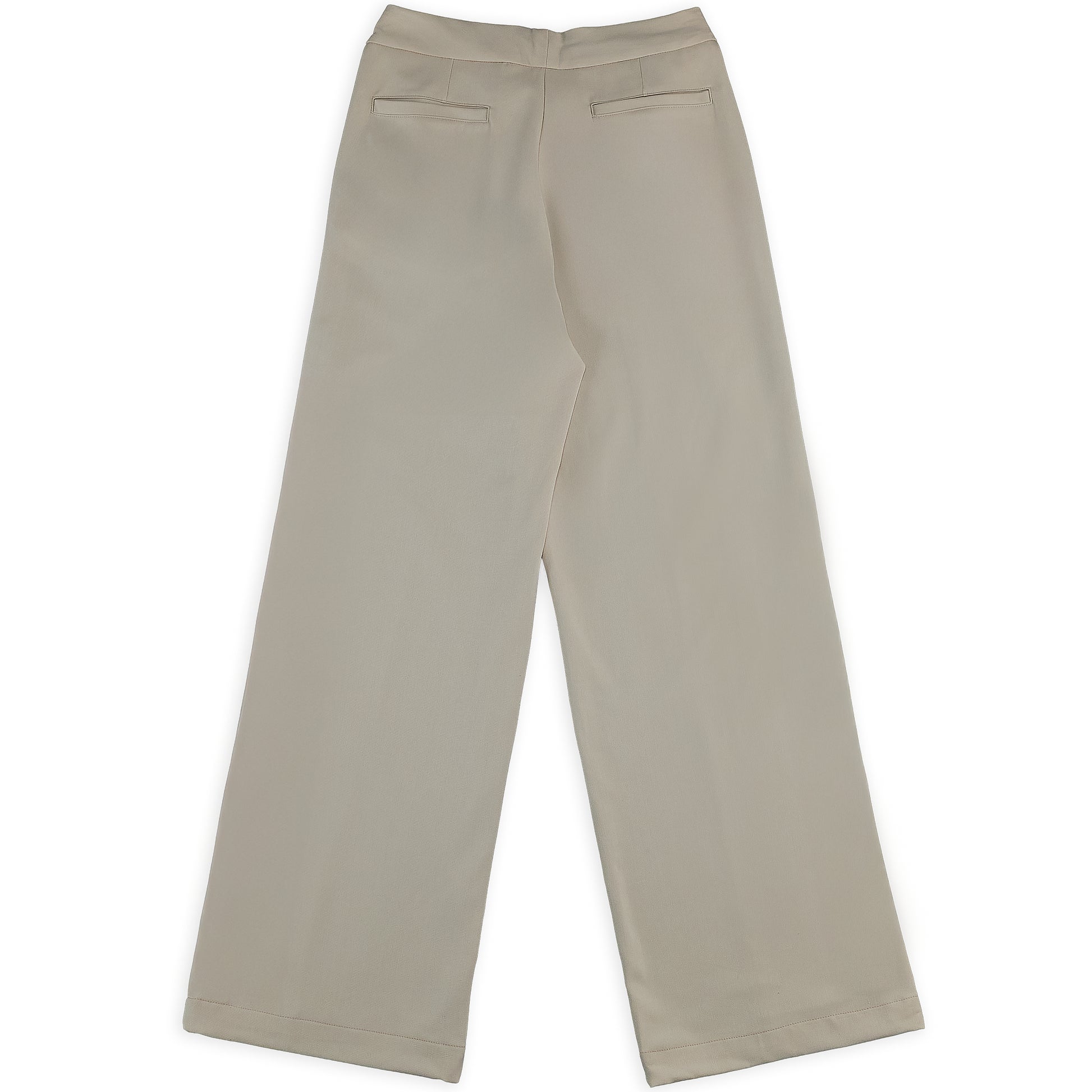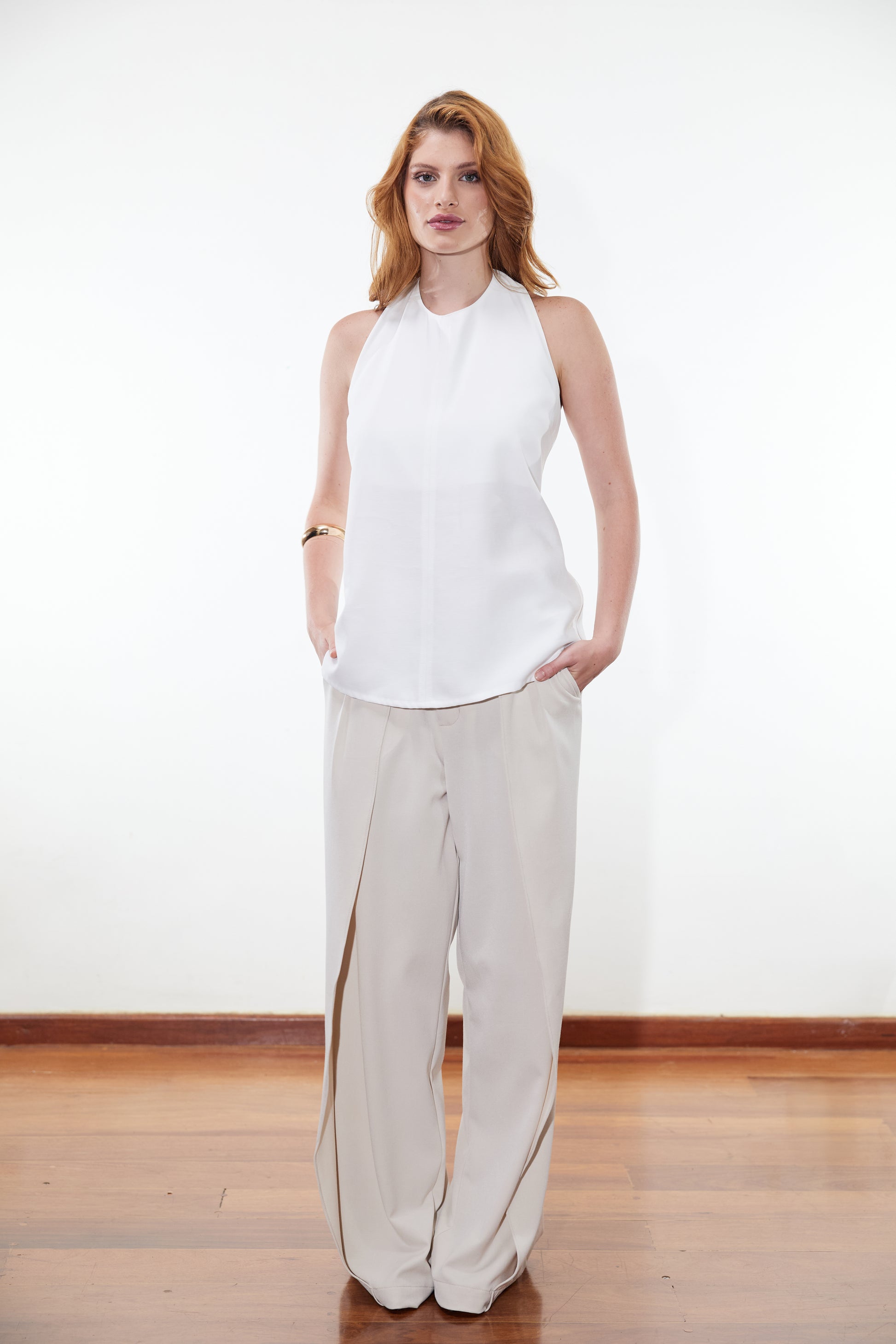 Calça com modelagem Pantalona conta com bolsos faca, fechamento com colchetes e zíper. Bolsos embutidos nas costas e duas sobreposições frontais que criam pregas e tornan o modelo contemporâneo com um toque de leveza e fluidez.